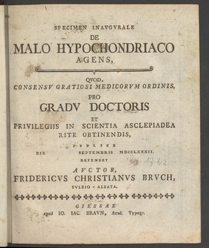 Specimen inavgvrale de malo hypochondriaco agens / qvod ... pro gradu doctoris ... pvblice die Septembris MDCCLXXXII defendet avctor, Fridericvs Christianvs Brvch, Svlzio - Alsata