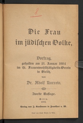 Die Frau im jüdischen Volke : Vortrag, gehalten am 21. Januar 1884 im isr. Frauenwohlthätigkeits-Verein in Bielitz / von Dr. Adolf Kurrein