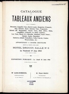 Catalogue des tableaux anciens : par ou attribués à Bronzino, Cappelle (Van), David (Louis), Desportes (François) [und weiteren] : appartenant à divers amateurs : dont la vente aura lieu Hôtel Drouot, Salle No 6, le vendredi 17 juin 1910 / Lair Dubreuil, commissaire-priseur ; Henri Haro, peintre-expert