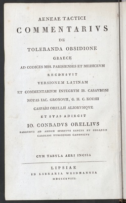 Aeneae Taciti Commentarivs De Toleranda Obsidione Graece : Ad Codices Mss. Parisienses Et Medicevm Recensvit Versionem Latinam Et Commentarivm Integrvm Is. Casavboni Notas Iac. Gronovii, G. H. Koesii Caspari Orellii Aliorvmqve Et Svas Adiecit Io. Conradvs Orellivs, Parochvs Ad Aedem Spiritvs Sancti Et Collegii Carolini Tvricensis Canonicvs. Cvm Tabvla Aeri Incisa