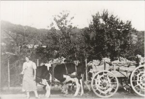 Junge Frau steht vor für den Weinfestumzug geschmückten Ochsengespann