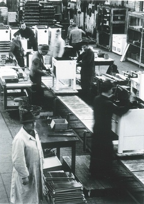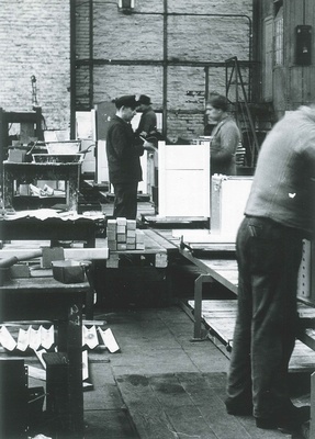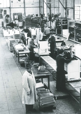Schwarz-Weiß-Aufnahmen in Werkstatthallen der Firma Zettelmeyer