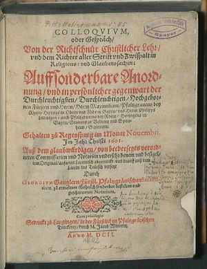 Colloquium, oder Gespräch/ Von der Richtschnur Christlicher Lehr/ und dem Richter aller Stritt und Zwispalt in Religions- und Glaubenssachen : Auff sonderbare Anordnung/ und in persönlicher gegenwart ... Herrn Maximiliani/ Pfaltzgravens bey Rhein ... und Herrn Philipps Ludwigen/ auch Pfaltzgravens bey Rhein ... ; Gehalten zu Regenspurg im Monat Novembri, Im Jahr Christi 1601 / Auß dem ... Original/ anfangs Lateinisch abgetruckt/ und drauff auß dem Latein ins Teutsch versetzt Durch Georgium Gauglern ...