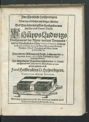 Zwo Christliche Leichpredigten Uber dem tödtlichen vnd seligen Ableiben Deß Durchleuchtigsten Hochgebornen Fürsten vnd Herrn/ Herrn Philipps Ludwigs Pfaltzgrauens bey Rhein ... : Dero eine vor Abfürung deß Fürstl. Leichnams den 19. Septemb. Anno 1614. in der Hofkirchen zu Newburg an der Donaw/ Die ander bey der Begräbnus desselben den 22. bemeltes Monats vnd Jahrs inn der Stattkirchen zu Laugingen gehalten / durch Jacob Heilbrun[n]ern D. Hofpredigern