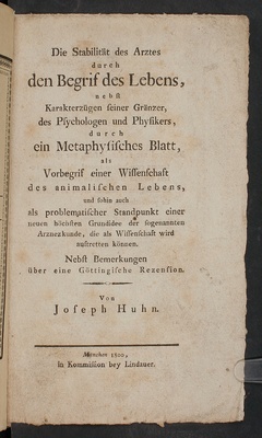 Die Stabilität des Arztes durch den Begrif des Lebens : nebst Karakterzügen seiner Gränzer, des Psychologen und Physikers, durch ein Metaphysisiches Blatt, als Vorbegrif einer Wissenschaft des animalischen Lebens, und sohin auch als problematischer Standpunkt einer neuen höchsten Grundidee der sogenannten Arznezkunde, die als Wissenschaft wird auftretten können. Nebst Bemerkungen über eine Göttingische Rezension / Von Joseph Huhn