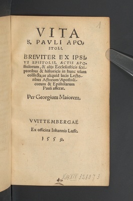 Vita S. Pavli Apostoli : breviter ex ipsius epistolis, actis apostolorum & aliis ecclesiasticis scriptoribus & historicis in hunc usum collecta, ut aliquid lucis Lectoribus Actorum Apostolicorum & Epistolarum Pauli afferat / per Georgium Maiorem