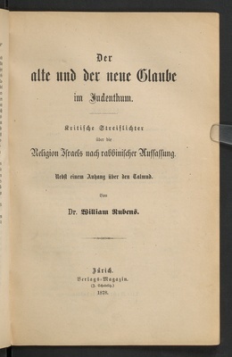 Der alte und der neue Glaube im Judenthum : kritische Streiflichter über die Religion Israels nach rabbinischer Auffassung : nebst einem Anhang über den Talmud / von Dr. William Rubens