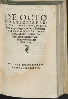 DE OCTO || ORATIONIS PAR=||TIVM CONSTRVCTIONE || libellus perelegans, authore Desiderio || ERASMO ROTERODA=||MO. Scholijs Henrici Pri-||maei apud Monasterien-||ses gymnasiarchae || illuatratus.||