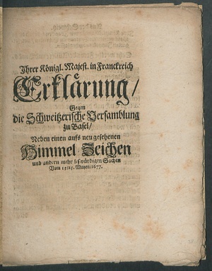 Jhrer Königl. Majest. in Franckreich Erklärung/ Gegen die Schweitzerische Versamblung zu Basel/ Neben einen aufs neu gesehenen Himmel-Zeichen und andern mehr leswürdigen Sachen : Vom 15/25. Mayen/ 1677
