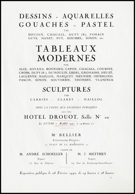 Dessins, aquarelles, gouaches, pastels : par Boudin, Chagall, Dufy (R.), Forain [und weitere] : tableaux modernes : par Alix, Aoyama, Bonnard, Capon, Chagall, Coubine [und weitere] : sculptures par Carriè8, Claret, Maillol : dont la vente aux enchères publiques aura lieu Hôtel Drouot, Salle No 10, le lundi 2 mars 1942 / Me Bellier, commissaire-priseur ; assisté de André Schœller, J. Metthey