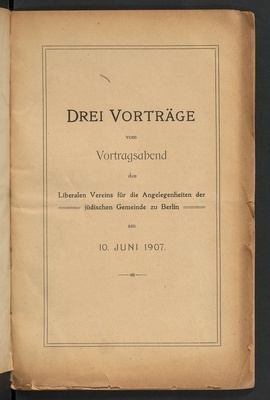 Drei Vorträge vom Vortragsabend des Liberalen Vereins für die Angelegenheiten der jüdischen Gemeinde zu Berlin am 10. Juni 1907 / von Oscar Cassel, Bernhard Breslauer, Hermann Senator