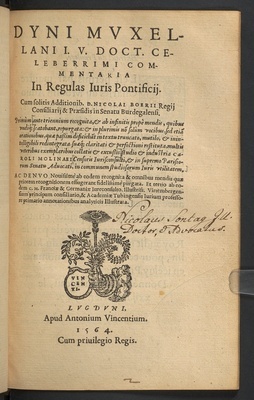 Dyni Mvxellani Commentaria in regulas iuris pontificii / primùm ... studio & industria Caroli Molinae ... ac denuo novissimè ab eodem recogn.