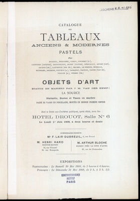 Catalogue des tableaux anciens & modernes : pastels : par ou Braedel, Breughel, Corot, Courbet (G.) [und weiteren] : objets d'art : statue en marbre par J. M. van der Kemp: La source : statuette, bustes et vases en marbre : paire de vases en porcelaine, montés en bronze, Premier Empire : dont la vente aux enchères publiques, après décès, aura lieu Hôtel Drouot, Salle No 6 le lundi 1er juin 1908 / commissaire-priseur F. Lair Dubreuil ; Henri Haro, peintre-expert, Arthur Bloche, expert près la Cour d'Appel