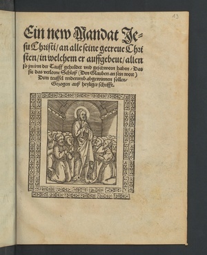 Ein new Mandat Jesu Christi, an alle seine getruen Christen, in welchem er auffgebeut, allen so jm in der Tauff gehuldet vnd geschworn haben, Das sie das verlorne Schloß (Den Glauben an sein wort) : dem teuffel widerumb abgewinnen sollen, Gezogen auß heyliger schrifft ; [Holzschnitt] / Verf.: Nikolaus Herman