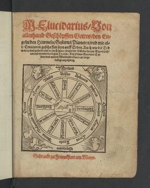 M. Elucidarius : von allerhand Geschöpffen Gottes, den Engeln, den Himmeln, Gestirns, Planeten und wie alle Creaturen geschaffen seyn auff Erden; auch wie die Erd in drey theil getheilt und deren Länder sampt der Völcker darinn Eigenschafften und wunderbarlichen Thieren ; auß Plinio Secundo, Sollino und andern Weltbeschreibern ein kurtze lustige anzeigung