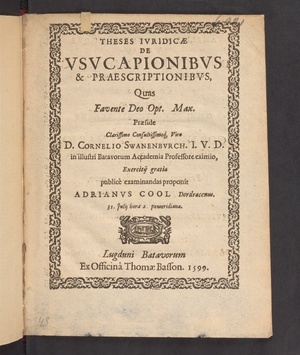 Theses Ivridicæ De Vsvcapionibvs & Praescriptionibvs, / Quas ... Præside ... D. Cornelio Swanenbvrch. ... Exercitij gratia publice examinandas proponit Adrianvs Cool Dordracenus. 31. Julij hora 2 pomeridiana.