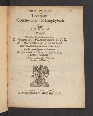 Theses juridicæ de locatione, conductione, et emphyteusi ... / Præside ... Cornelio Swanenburch .... Publice exercitij gratia tueri conabitur Gysbertus de Naene à Nyvelt, Rheno-Trajcectinus. Ad diem 11 Decemb. [] Hora solita In auditorio Maximo