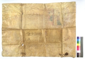 Eine Gruppe von 12 genannten Erzbischöfen und Bischöfen gewährt der Marienkapelle des Benediktinerinnenklosters Rupertsberg, wo auf wundersame Weise aus dem Herzen eines Marienbildes Blut geflossen war, einen Ablass, damit die Kapelle von zahlreichen Gläubigen besucht werde. Alle Büßer, die an den Festen der Kirchenpatrone, am Kirchweihtag und an weiteren Festen, nämlich Weihnachten, Beschneidung des Herrn, Erscheinung des Herrn, Karfreitag, Pfingsten, Trinitatis, Fronleichnam, Kreuzauffindung, Kreuzerhöhung, allen Marienfesten, den Festen Johannes d. Täufers und Johannes d. Evangelisten, der Apostel Petrus und Paulus und aller Apostel und Evangelisten sowie namentlich aufgezählter Heiliger und während der Oktav der genannten Feste, die Kapelle zum Gebet oder als Pilger aufsuchen oder die Messen, Predigten, die Matutin, die Vesper oder andere Gottesdienste besuchen, ferner die, die den Leib Christi oder das heilige Öl als Kranke empfangen, diejenigen, die mit gebeugten Knien dreimal Ave Maria beten, die zum Bau, zur Beleuchtung und zum Kirchenschmuck der Kapelle beitragen oder sie irgendwie anders unterstützen, diejenigen, die ihr in Testamenten Gold, Silber und Paramente vermachen oder andere mildtätige Stiftungen an die Kapelle leisten, alle die, die vor dem Marienbild knien und es mit Gebeten grüßen oder Spenden geben, also jeder, der das Vorgenannte oder etwas davon ehrerbietig vollzieht, erhält 40 Tage Ablass von allen auferlegten Bußen. Siegler: die 12 Aussteller