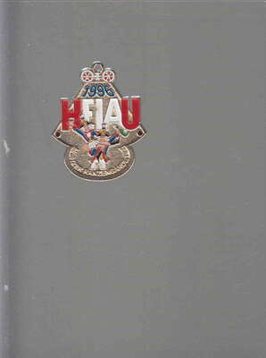 runde silberfarbene Plakette mit Reiterin (gelb), schwarzes Pferd, Mainzer + Kölner Dom