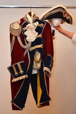 weißer Uniformrock mit rotem Einsatz, weiße Reithose, Epauletten silber mit gekreutzten Marschallstäben, silberne Fangschnur, Ärmelspitzen, weiße Handschuhe, Schärpe grün mit MPG-Stern, Hut schwarz mit Halbperücke (Holzschrank 2)
