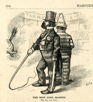 The new organ - (we beg the "Tribune's" pardon) -ization on its "New departure." - Any thing to get votes. [Anschließend folgt ein Textblock] : Whitelaw Reid tritt vor einer Menschenmenge als Leierkastenmann auf und Greeley, als Affe dargestellt, sammelt mit einer Büchse Wählerstimmen ein / [Thomas Nast]