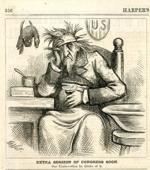 Our national honor is pledged. Smart Uncle. "The international arbitration in the Alabama case was all right, but quite another thing." : Uncle Sam denkt missmutig über seine finanzielle Lage nach. [In der Zeichnung befinden sich mehrere Textblöcke] / Th. Nast