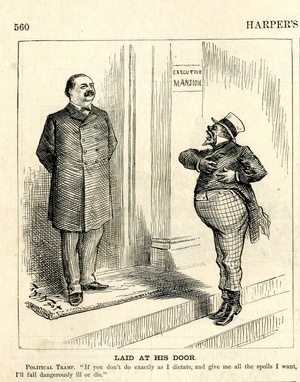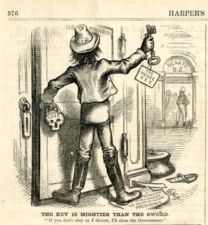 "Whom the Gods wish to destroy they first make mad." The political trap Dollar. "If you don't respect me, I will abolish you; and if the people don't respect me, I will abolish the - people." : ein Mann, dessen Kopf eine wertlose Dollarmünze darstellt, versucht in eine Bank einzudringen / Th. Nast