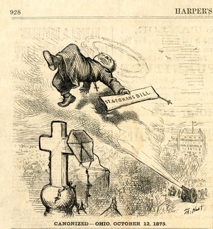 The "Ohio idea" of baby-farming. [Anschließend folgt ein Textblock] : eine Schauspielerin, die die Demokratische Partei von Ohio darstellt, tritt zusammen mit einer Schnapsflasche und einer Stoffpuppe auf einer Theaterbühne auf / Th. Nast