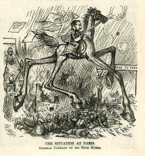 Behind again : die Zeichnung besteht aus 2 Bildern, die in der Reihenfolge von links nach rechts beschrieben werden: 1) General Grant reitet auf einem Pferd. Inschrift der Zeichnung: Down with the man on horseback. 2) General Hancock steht über einem Pferd und hält sich an dessen Schwanz fest. Inschrift der Zeichnung: Hoorah for the man on the horse- back! Democratic cry / Th. Nast