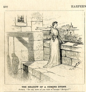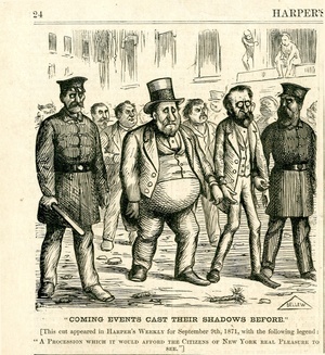 Shadows of forthcomming events : die Zeichnung besteht aus 13 Bildern. Inschrift der Zeichnung: Shadows of forthcomming events. In den einzelnen Darstellungen wird die Politik des Tammany Rings als demagogisch, korrupt und gewalttätig charakterisiert / Th. Nast