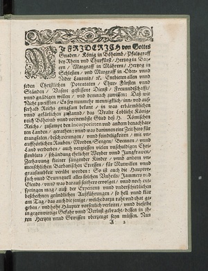 Vnser Friderichs von Gottes Gnaden K[oe]nigs in Beheimb/ Pfaltzgrafen bey Rhein/ vnnd Churf[ue]rsten/ [et]c. Offen Außschreiben: Warumb Wir die Cron B[oe]heimb/ vnd der Incorporirten L[ae]nder Regierung auff Vns genommen
