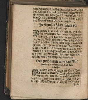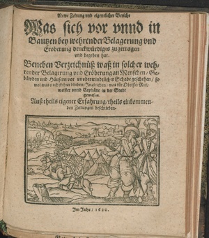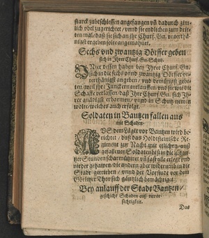 Newe Zeitung vnd eigentlicher Bericht Was sich vor vnnd in Bautzen bey wehrender Belagerung vnd Eroberung denckwürdiges zugetragen vnd begeben hat : Beneben Verzeichnüß waß in solcher wehrender Belagerung vnd Eröberung an Menschen/ Gebäwden vnd Häusern vor vnvberwindtlicher Schade geschehen/ so wol was noch stehen blieben/ Jngleichen/ was für Obriste/ Rittmeister vnd Capitäne in der Stadt gewesen. Auß theils eigener Erfahrung/ theils einkommenden Zeitungen beschrieben