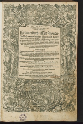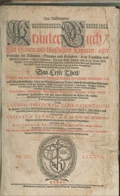 Sacht. des 1. enth. Theils: New vollkommenlich Kräuter-Buch Mit schönen vnd künstlichen Figuren/ aller Gewächs der Bäumen/ Stauden vnd Kräutern/ so in Teutschen vnd Welschen Landen/ ... wachsen ... / Jacobus Theodorus. - Sacht. des 2. enth. Theils: D. Iacobi Theodori Tabernaemontani New vnd vollkommen Kräuter-Buch Mit schönen/ künstlichen vnd leblichen Figuren vnd Conterfeyten/ allerhand vortrefflichster vnd fürnem[m]er/ so wohl frembder/ als eynheimischer Gewächs/ Kräuter/ Blumen/ Stauden/ Hecken vnd Bäumen ...