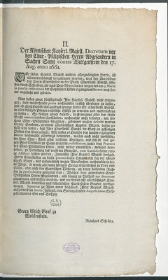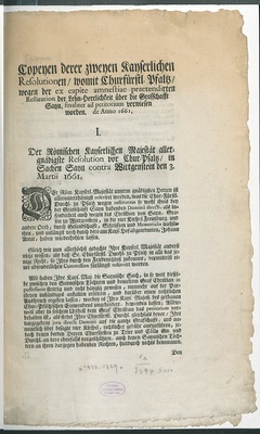 Copeyen derer zweyen Kayserlichen Resolutionen/ womit Churfürstl. Pfaltz/ wegen der ex capite amnestiae praetendirten Restitution der Lehn-Herrlichkeit über die Grafschafft Sayn, finaliter ad petitorium verwiesen worden. de Anno 1661