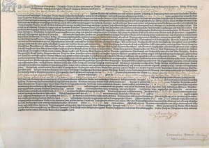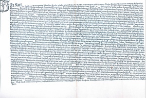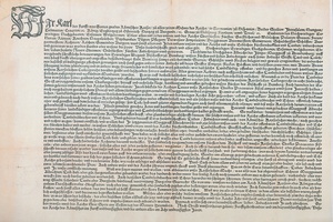 WJr Karl Der Funfft von Gots gnaden/ R[oe]mischer Keyser zů allen zeiten Merer des Reichs [et]c. Jn Germanien/ zů Hispanien ... || K[oe]nig ... Empieten allen vnd yeden Churfürsten/ Fürsten/ geistlichen vnd Welt=||lichen/ Prelaten ... || Vnser fre[ue]ntschafft gnad vnd alles gůt. Hochwirdigen/ Erwirdigen/ Hochgeborne[n]/ lieben || freund/ Neuen/ Ohemen/ Churfürsten/ Fürsten/ Auch Wolgebornen/ Edlen/ Ersamen/ lieben Andechtigen vnd getrewen. Wiewol in den nechstuerschinen Dreyen jaren/ dem Funff Sechs vnd Sie=||ben vnddreissigsten/ vil Mandata vnd gebots brieue/ von vnser Maiestat selbst. Auch dem Durchleuchtigen Fürsten/ herrn Ferdinanden R[oe]mischen ... K[oe]nigen [et]c. ... || verkhündet ... || was hohen oder nydern stands oder wesens der ist/ bei schweren straffen vnd peenen/ gepotten vnd verpotten/ Sich wider vns/ vnd gemelten vnsern freundtlichen lieben || Brůdern/ den R[oe]mischen K[oe]nig/ vnsere land vnd le[ue]the/ noch andere vnsere vnd des Reichs mitglider/ in frembder potentaten dienst/ Sonderlich des K[oe]nigs von Franckreich/ nit zůbegeben ... || Geben in vnser vnd des Reichs Statt Speyr/ am Zehenden tag des Monats Aprilis. Nach Christi vnnsers herren geburt/ Funfftzehenhundert vnd im || Acht vnddreissigsten ... Jaren.||