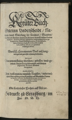 Kreütterbůch/|| Darin vnderscheidt/ Nam=||men/ vnd Würckung der Kreütter/ Stau=||den/ Hecken vnnd Beumen/ sampt jhren Fr#[ue]chten/ so inn || Teutschen Landen wachsen ... || fleissig dargeben ... || Jtem von den vier Elementen/ zamen vnd wilden Thie=||ren ... || Alles durch H.Hieronymum Bock ... || beschriben.|| Jetzund auffs new mit allem fleiß vbersehen ... || Durch ... MELCHIOREM SEBIZIVM Silesium,|| Der Artzney Doctorn zů Straßburg.|| Sampt ... Registern.||
