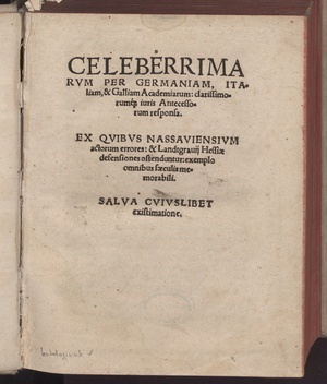 CELEBERRIMA||RVM PER GERMANIAM, ITA=||liam, & Galliam Academiarum: clarissimo=||rum[que] iuris Antecesso=||rum responsa.|| EX QVIBVS NASSAVIENSIVM || actorum errores: & Landtgrauij Hessiae || defensiones ostenduntur: exemplo || omnibus saeculis me=||morabili.|| SALVA CVIVSLIBET || existimatione.||