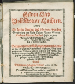 Helden Lied || Voñ Doctor Luthern.|| Oder:|| Ein kurtzer Auszug vnd Methodus/ von des || Ehrwirdigen ... Mannes/|| Doctoris Martini Lutheri Historien/ vom || Jar nach Christi Geburt/ 1517. biss || vff das 1546. in welchem er ... || verschieden.|| Darinnen fürnemblich angezogen wirdet/ wie || es jme vff etlichen Reichstägen ergangen/ Was auch || sonsten der Religion halben ... vorgeloffen.|| Welches alles aus seinen hinderlassenen Tomis/ vnd etlichen War=||hafften Historienschreibern/ ... || gezogen/ vnd in diss nachfolgende Gesang || gebracht ... || Durch||Valentinum Hebeysen Francum/ Anno 1591.|| Vnd ist im Thon des Alten Berggesangs/|| Ewiger Vatter im Himelreich ... ||