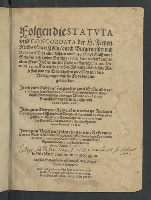 Folgen die Statvta vnd Concordata der H. Freyen Reichs Statt Cölln, durch Burgermeister vnd Raht, mit raht aller Rähten vnnd 44. sampt Gräff vnnd Scheffen deß hohen Gerichts, nach dero wolherbrachten alten Statt Rechten mittels Eyds auffgericht, Anno Domini 1437. : Die welche durch die Römische Königliche Maiestatt vnd den Ertzbischoffen zu Cöllen inn dero huldigungen mittels Eyds bestättiget worden