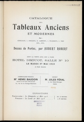 Tableaux modernes : par E. Boudin, Chintreuil, J.-B. Jongkind, S. Lépine, W. Mesdag, C. Pissarro, Roelofs, etc- : aquarelles modernes : par E. Lami, J.-B. Millet, J. Veyrassat, P. Vogler, etc. : tableaux anciens, gravures anciennes, faïences, porcelaines, objets varies, pendules, bronzes : sièges et meubles, tapisseries : succession de Madame J. K. ... : dont vente aux enchères publiques aura lieu à Paris, Hôtel Drouot,Salle No 2, le lundi 15 juin 1931 / commissaires-priseurs: Henri Baudoin ; experts Jos. Hessel, F. Max-Kann, M. Mannheim