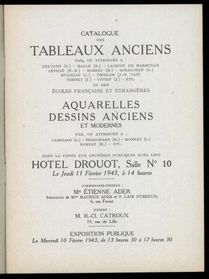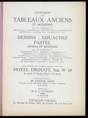 Catalogue des tableaux modernes : par ou attribués a: Rosa Bonheur, L. Cabat, Th. Couture, K. Daubigny, Decamps, N. Diaz de Pena, G. Doré, Fromentin, J.-L. Gérome, Meissonier, Th. Rousseau, C. de Tournemine, C. Troyon, F. Ziem :œuvres importantes par Corot et E. Delacroix : aquarelles et dessins modernes, sculptures par G. Doré, tableaux anciens et modernes : par ou attribués a: ..... : dessins anciens : succession de Mademoiselle T. ... : dont vente aux enchères publiques ... aura lieu à Paris, Hôtel Drouot, Salle No 1, le jeudi 19 novembre 1931 / commissaires-priseur: Maurice Pecquet