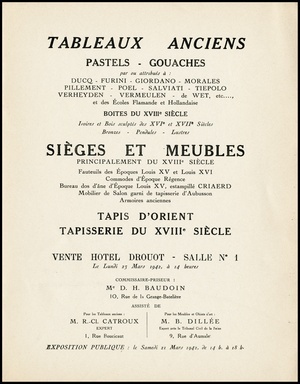 Tableaux anciens et modernes : Collection de Madame E.T. de S... : par H. van Balen, J. van Bredael, G. Coques, C. Dietrich, G. Lundens [und weitere] : miniatures des XVIIIe et XIXe siècles : importante miniature de l'École Hollandaise du XVIe siècle : miniature de l'École Espagnole du XVIe siècle : boîtes : dont la vente aura lieu à Paris, Hôtel Drouot, Salle No 8, le mecredi 2 décembre 1925 / commissaires-priseur: F. Lair Dubreuil ; experts pour les tableaux anciens Jules Féral, pour les tableaux modernes André Schœller, pour les miniatures Édouard Pape