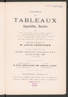 Aquarelles et dessins par Gavarni : dont une suite importante de vingt aquarelles : pour les personnages de "La Dame aux Camélias" : provenant de la Collection de Madame X... : dont la vente aura lieu Hôtel Drouot, Salle No 10, le vendredi 2 juillet 1926 / commissaire-priseur: André Desvouges ; expert Hector Brame
