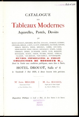 Catalogue des tableaux modernes : aquarelles, pastels, dessins : par Barat-Levraux, Bonamici, Bouche, Chagall, Charlot, Clément [und weiteren] : œuvres importantes de Forain : Collection de Monsieur M... : dont la vente aux enchères publiques aura lieu à Paris, Hôtel Drouot, Salle No 6, le vendredi 3 mai 1929 / Alph. Bellier, commissaire-priseur ; Jos. Hessel, expert près la Cour d'Appel