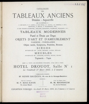 Catalogue des tableaux anciens : dessins, aquarelles : par ou attribués à: P. de Bloot, P.-C. Canot, A. van Dyck, J.-L. David, J.-B. Greuze, P. Lely [und weiteren] et des Écoles allemande, anglaise, espagnole, flamande, française etc. : tableaux modernes : pastel et dessin par Degas : objets d'art et d'ameublement : faïences - porcelaines : objets variés, sculptures, pendules, bronzes : sièges estampillés de: Jacob, Michard, Lavisse, Boulard : meubles estampillés de: Riesener, Saunier, Boudin, Criard : tapisserie, tapis : dont la vente aux enchères publiques aura lieu à Paris, Hôtel Drouot, Salle No 1, le vendredi 17 mars 1933 / commissaire-priseur Henri Baudoin ; experts: Pour les tableaux: F. Max-Kann, pour les objets d'art M. Mannheim