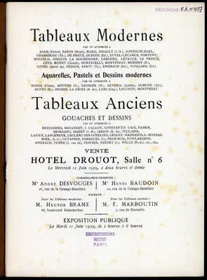 Tableaux modernes : par ou attribués à Adam (Victor), Baron (Henri), Biard, Bidault (J.-X.), Bornschlegel [und weitere] : aquarelles, pasels et dessins modernes : par ou attribués à Boggs (Frank), Bottini (G.), Daumier (H.), Deveria (Achille), Dubufe (Ed.) [und weitere] : gouaches et dessins : par ou attribués à Breenberg, Bruandet, J. Callot, Constantin d'Aix, Fassin [und weitere] : vente Hôtel Drouot, Salle No 6, le mercredi 12 juin 1929 / commissaires-priseurs: André Desvouges, Henri Baudoin ; experts pour les tableaux modernes: Hector Brame, pour les tableaux anciens: F. Marboutin