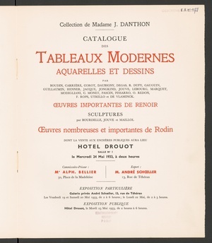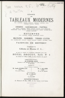 Catalogue des tableaux modernes : aquarelles, pastels, dessins : par Carrière, Cottet, Cross, Degas, Gauguin, Guérin, Jacque [und weiteren] : œuvres nombreuses et importantes de Forain : sculptures par Dalou et Rodin : gravures et lithographies par Carrière, Forain, Jongkind, Rodin : composant la Collection de M. E. L. : dont la vente aux enchères publiques aura lieu Hôtel Drouot, Salle No 6, le samedi 22 novembre 1930 / F. Lair Dubreuil, commissaire-priseur ; experts pour les tableaux J. Allard, A. Schœller, expert pour les gravures J. Cailac