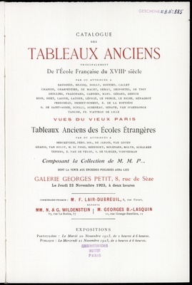 Catalogue des tableaux anciens et modernes : par ou après: L. Boilly, Grimoux, J.-B. Huet, Lagrenée, Swebach, Taunay [und weitere] : trois tableaux de l'École impressionniste par C. Monet, Sisley, Guillaumin : dessins, aquarelles, gouaches : par ou après: Boilly, Caresme, Carmontelle, Desrais, Greuze, Langendyck [und weitere] : estampes du XVIIIe siècle : par: Baudoin, Boilly, Debucourt, Fragonard, Huet, Janinet, H. Robert, etc. : provenant de la Collection d'un amateur : dont la vente aura lieu Hôtel Drouot, Salle No 6, le jeudi 1er mars 1906 / commissaire-priseur: Paul Chevallier ; experts M. Paulme & B. Lasquin Fils