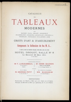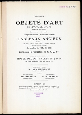 Catalogue des tableaux modernes : aquarelles et dessins : par: J. Bail, Bonnat, A. Brouillet, Chaplin, Chrétien, Dagnan-Bouveret [und weitere] : objets d'art et d'ameublement : anciennes faïences de Rouen, Delft, Hispano-Mauresques, etc. : objets variés : sièges et meubles : Composant la Collection de M. X... : et dont la vente aura lieu à Paris, Hôtel Drouot, Salle No 1, les vendredi 7 et samedi 8 décembre 1906 / commissaire-priseur: Paul Chevallier ; expert pour les tableaux: Jules Féral, pour les objets d'art: M. Mannheim