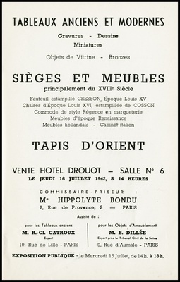 Catalogue des tableaux anciens et modernes : dessins, aquarelles, gouaches : par Brascassat, Casanova, Chaplin, Demarne, Duplessis, Descours, Desportes [und weiteren] : porcelaines, faïences, objets de vitrine : bronzes d'ameublement, pendules d'époque et style Louis XIV, Louis XV et Louis XVI : bijoux : montés de brillants et pierres de couleur : argenterie ancienne et moderne : meubles et sièges anciens et de style : dont la vente aux enchères publiques après décès de Madame Vve B... aura lieu Hôtel Drouot, Salle No 11, les jeudi 18, vendredi 19 et samedi 20 juin 1908 / commissaire-priseur F. Lair Dubreuil ; experts pour les tableaux et objets d'art: M. Paulme et B. Lasquin Fils, pour les bijoux: A. Reinach